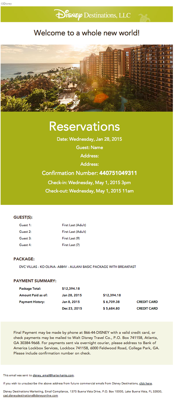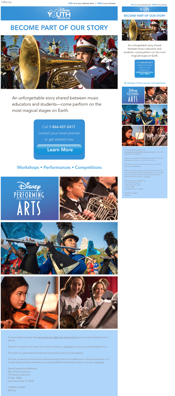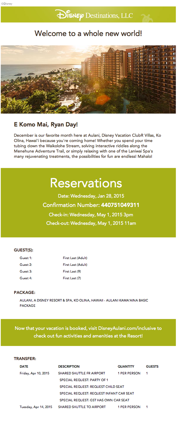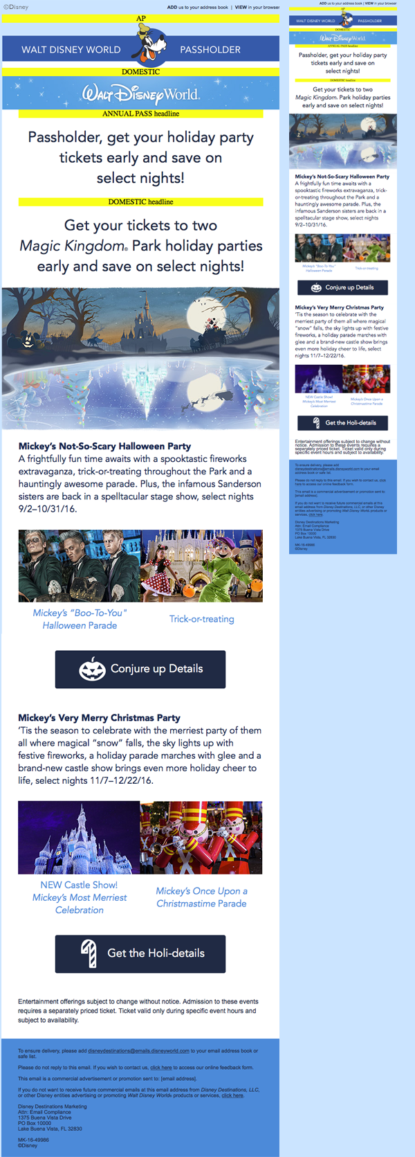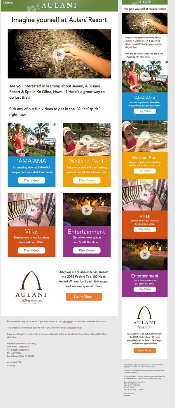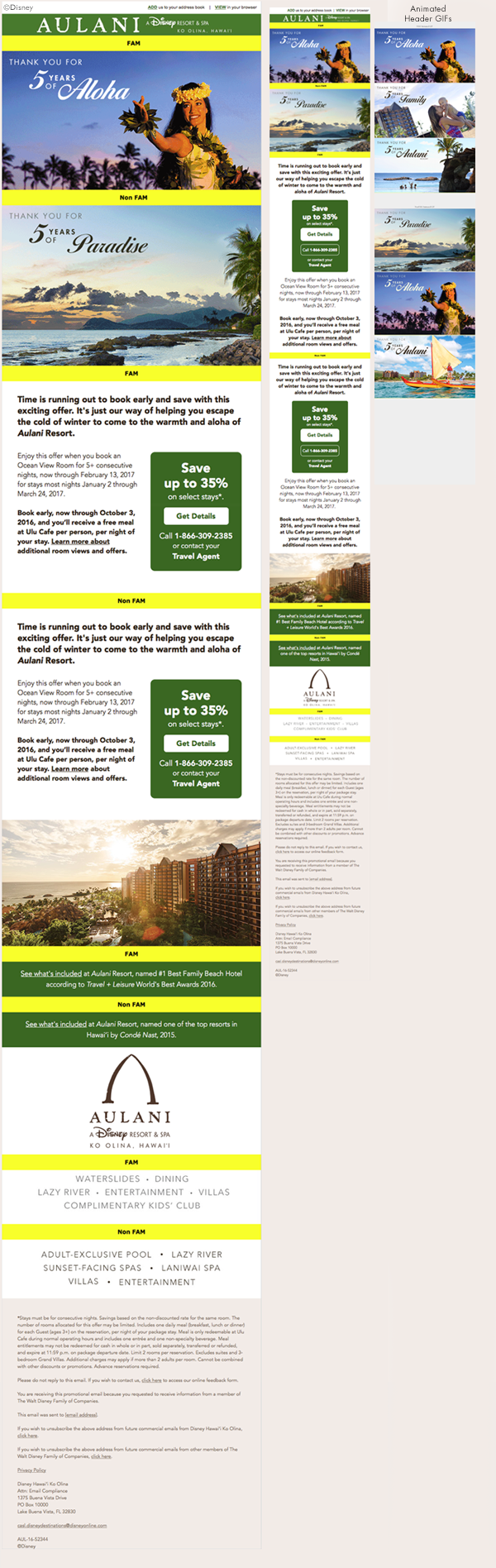 These emails show inline style, code driven, desktop to mobile variations. HTML complexities range from simple, single unit campaigns such as Aulani® Aspire Non-Fam to dynamic driven (variables indicated with yellow bars) such as Adventures by Disney® River Cruise to units delivered in a series such as the Aulani® Resort Booking Detail Emails.