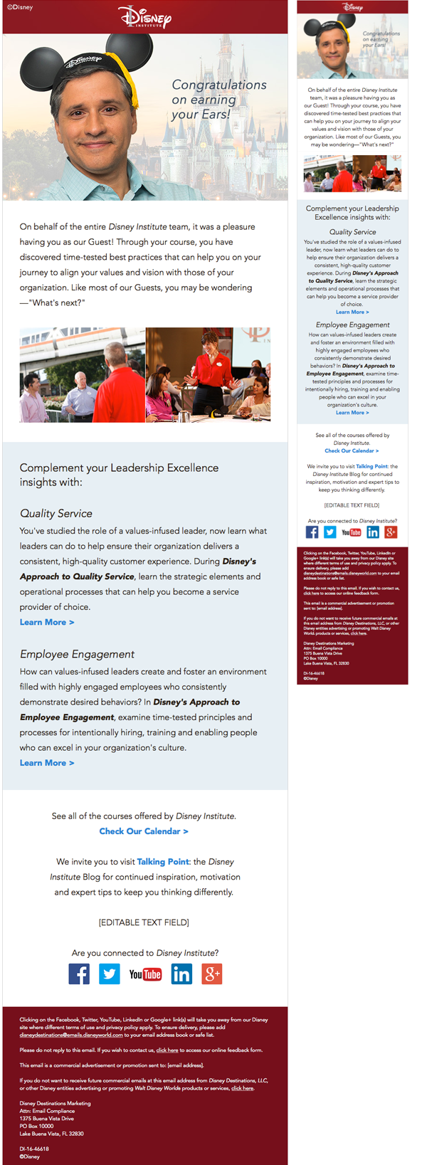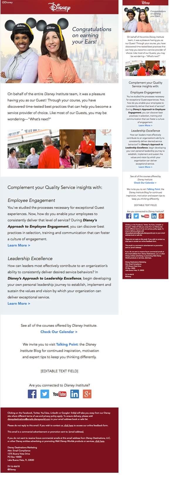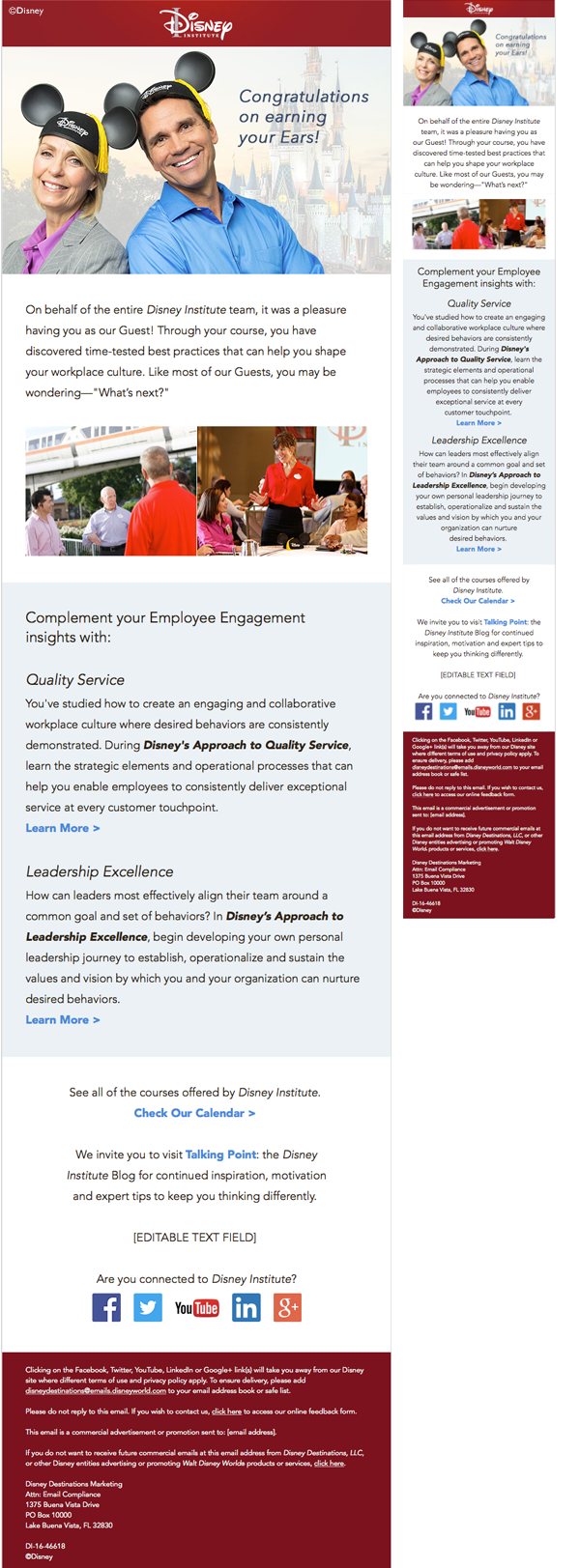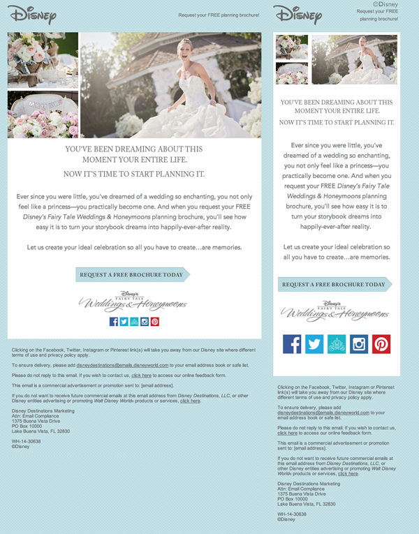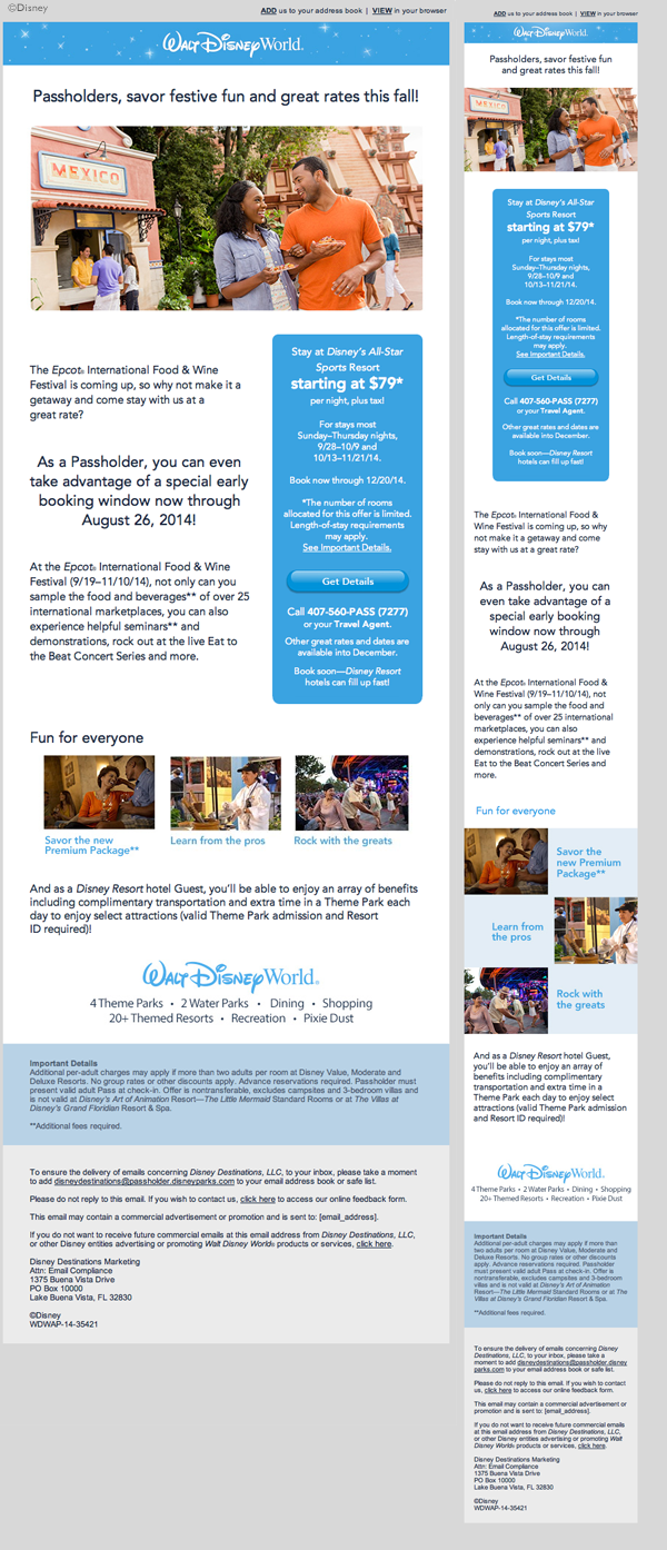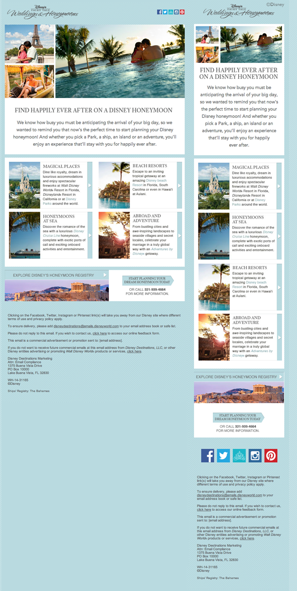 These emails show inline style, code driven, desktop to mobile variations. HTML complexities range from simple, single unit campaigns such as Aulani® Aspire Non-Fam to dynamic driven (variables indicated with yellow bars) such as Adventures by Disney® River Cruise to units delivered in a series such as the Aulani® Resort Booking Detail Emails.